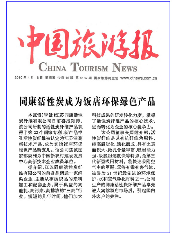 中國(guó)旅游報(bào)——同康活性碳成為飯店環(huán)保綠色產(chǎn)品